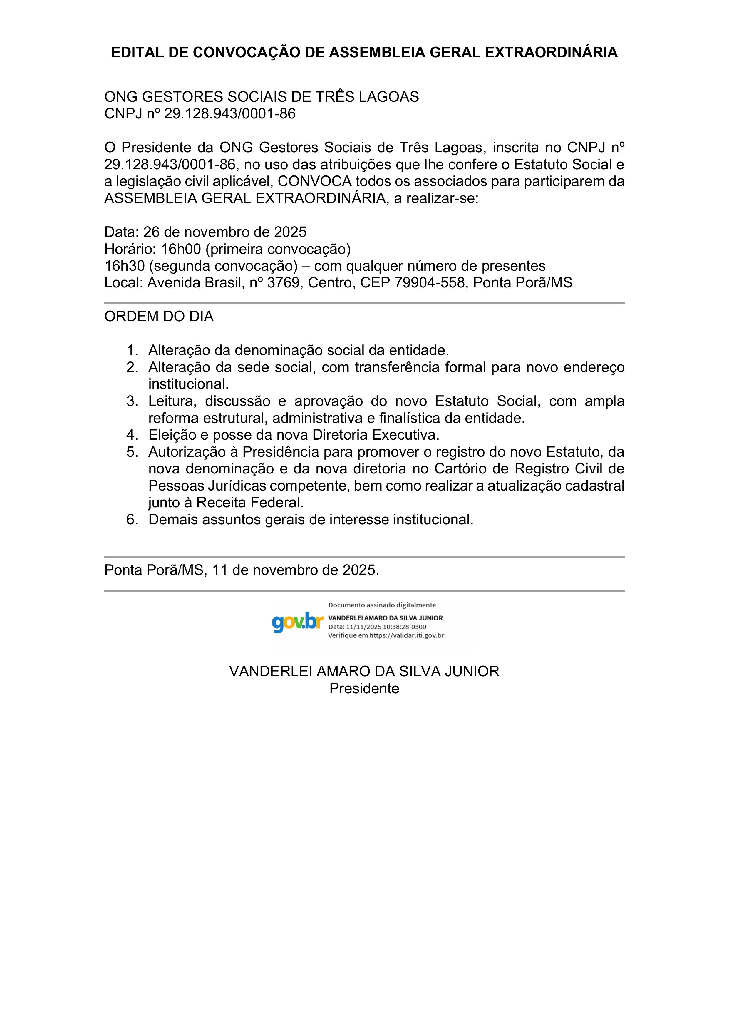 A ONG Gestores Sociais de Três Lagoas (CNPJ nº 29.128.943/0001-86) prepara-se para uma transformação institucional significativa. A presidência da entidade convocou todos os seus associados para uma Assembleia Geral Extraordinária que será realizada no próximo dia 26 de novembro de 2025.